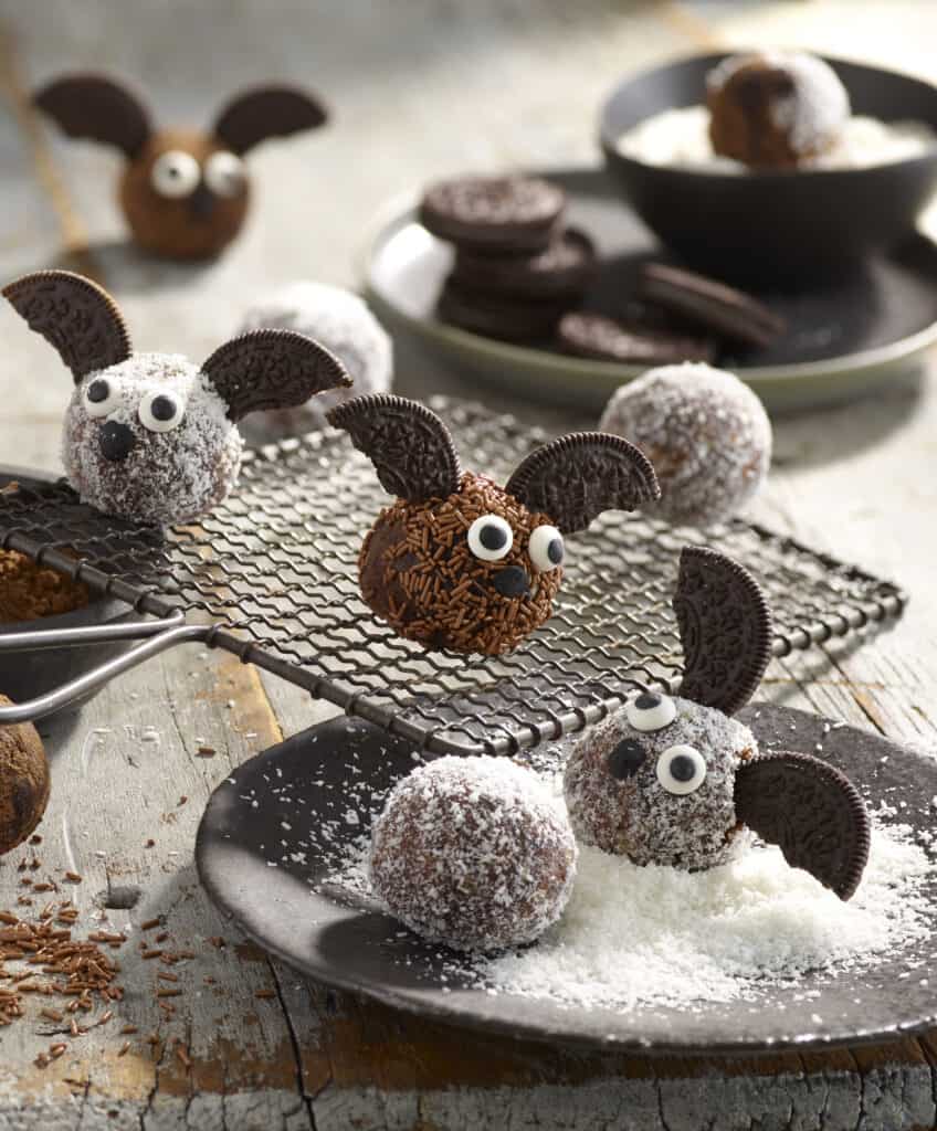 - Slice an Oreo cookie in half and scrape away the filling. Break the cookie in half to make 2 wings and insert into the side of the energy ball. Break small pieces of cookie to make the noses.